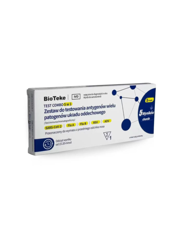 Test Combo 5w1 BioTeke to wyrób medyczny in vitro w formie testu immunochromatograficznego. Umożliwia jakościowe wykrywanie antygenów pięciu patogenów układu oddechowego: