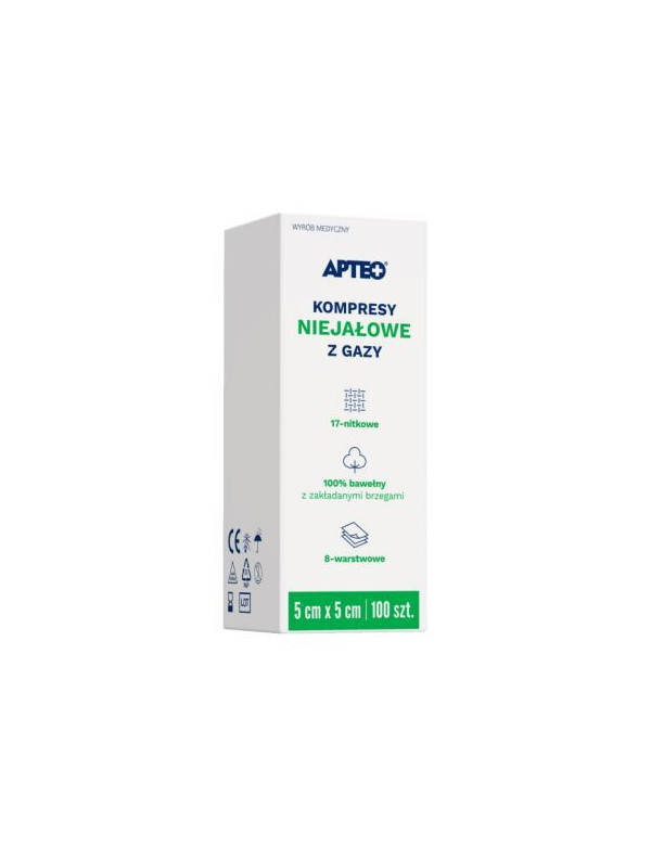 Niejałowe kompresy z gazy APTEO stanowią podstawowy materiał opatrunkowy stosowany do opatrywania wszelkiego rodzaju ran. Wykonane z gazy bielonej, bezpieczne i delikatne dla skóry. Wersja niejałowa kompresów.